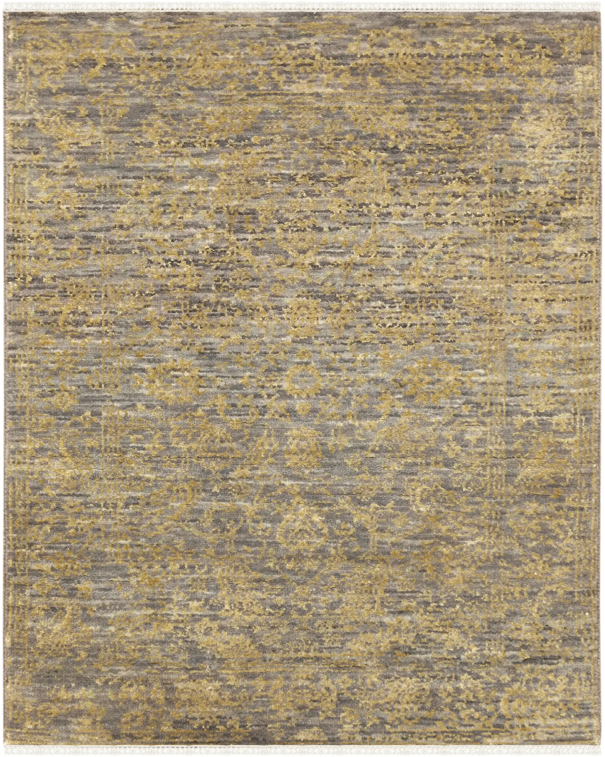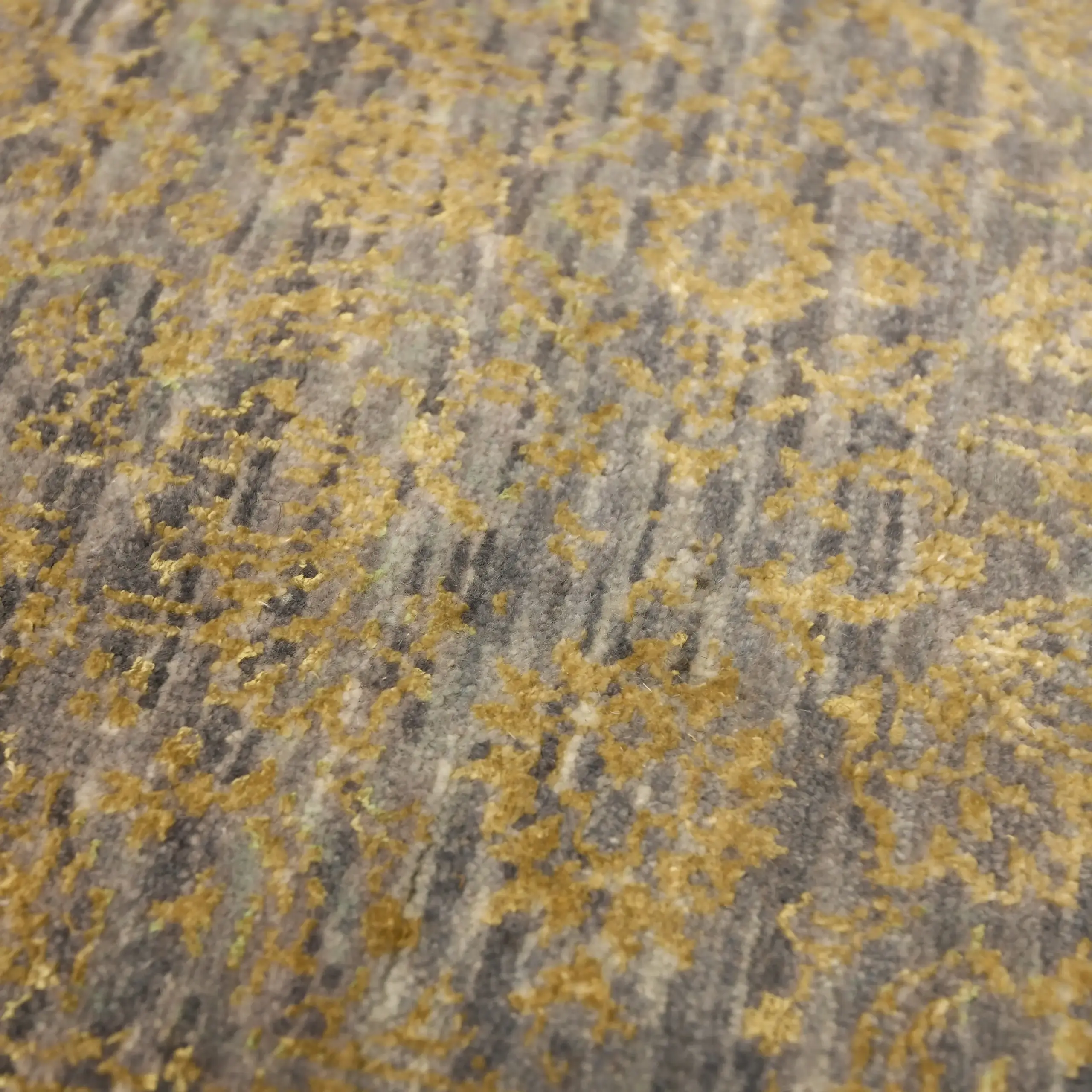 This textured distressed grey wool carpet is simple to maintain. We suggest that you vacuum regularly without a stiff beater brush at the base of the rug to protect the densely packed knots, which are hand-tied. For spills, blot at once using a dry, clean cotton cloth. Its natural wool fibers appreciate a gentle approach, so avoid the use of heavy-duty chemicals. We wash them authentically so the beautiful silver and grey shades stay muted, never fading or bleeding.