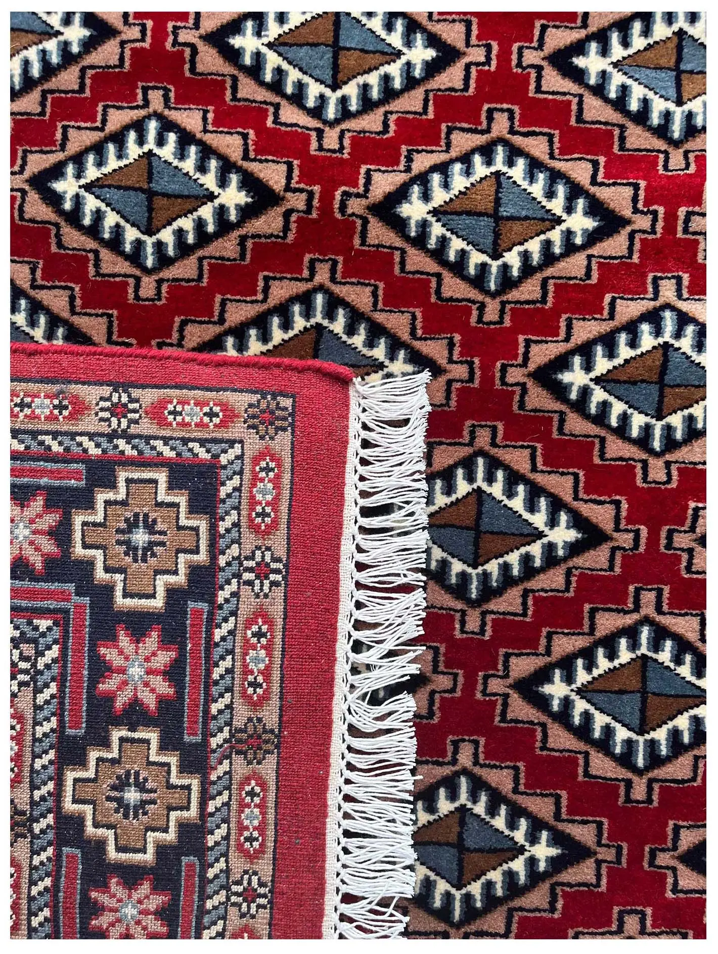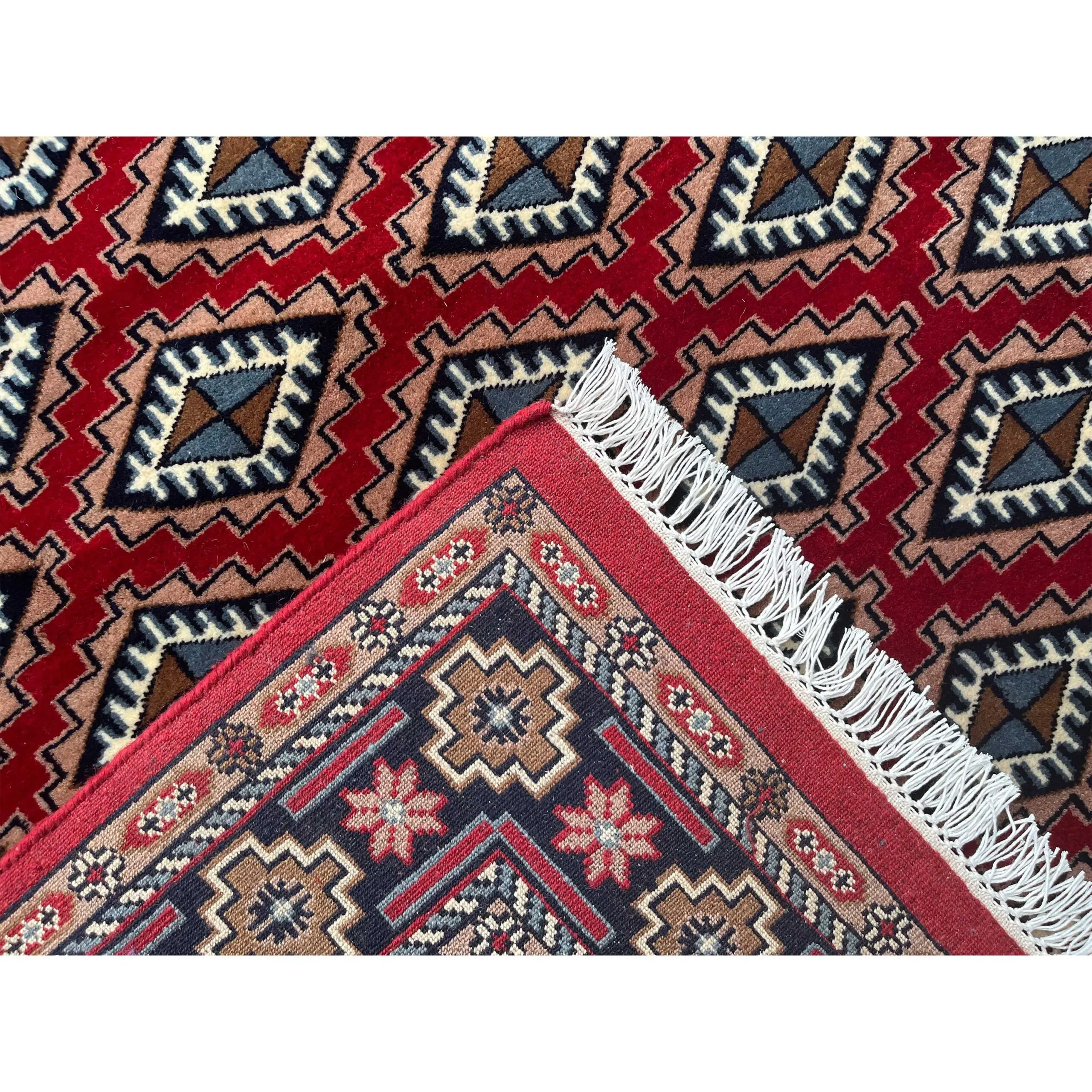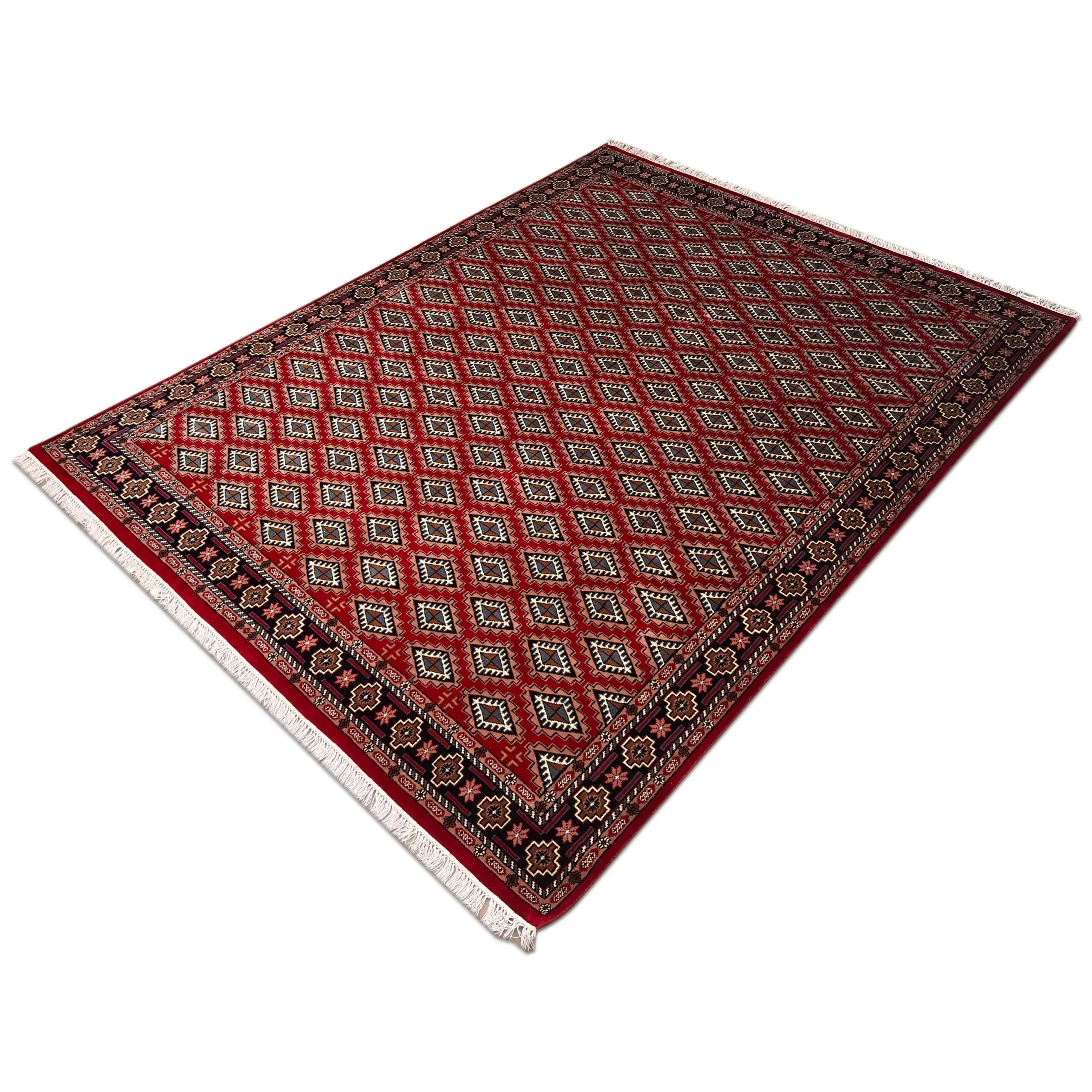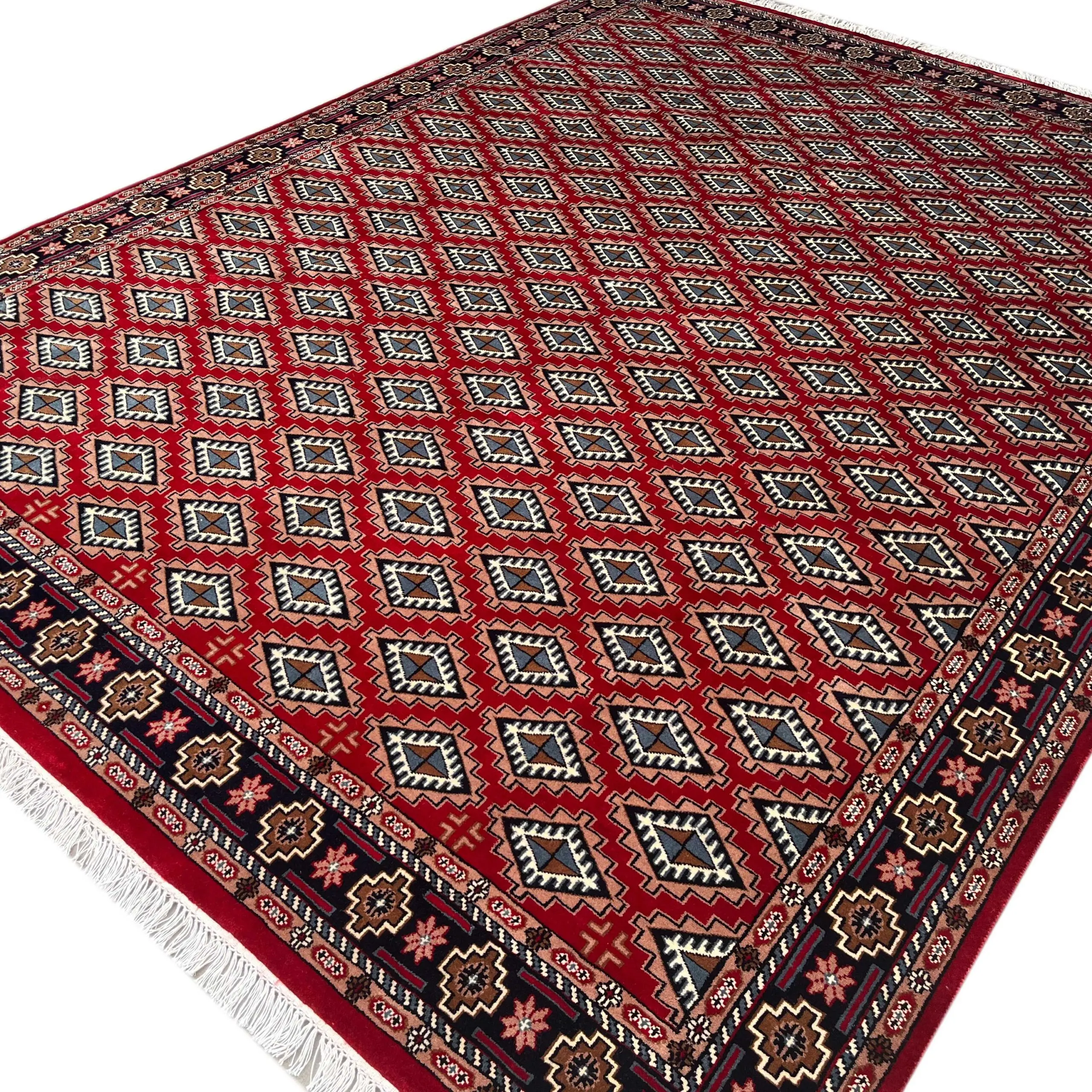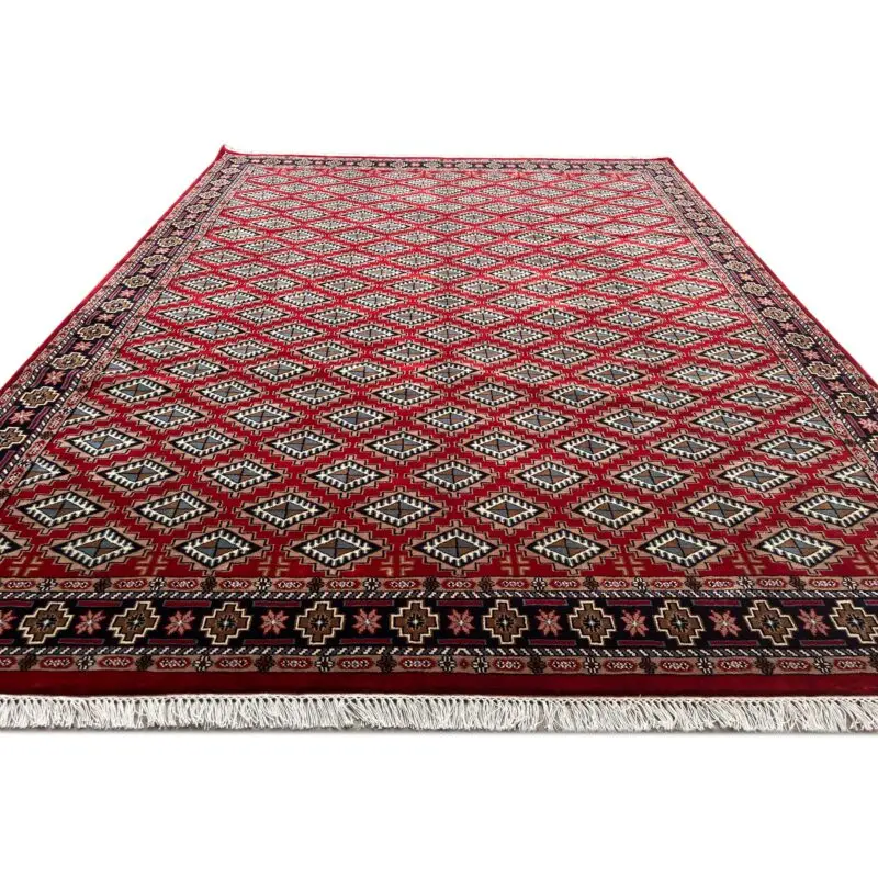 We are so excited to bring you this gorgeous transitional red wool carpet. The Bokhara pattern is renowned across the globe for its repeating motifs known as ‘Gul,’ or diamond-shaped patterns. All knots are hand-tied by our skilled artisans. This painstaking hand-knotting makes the rug strong and beautiful in a way that no machine-made carpet could approach.