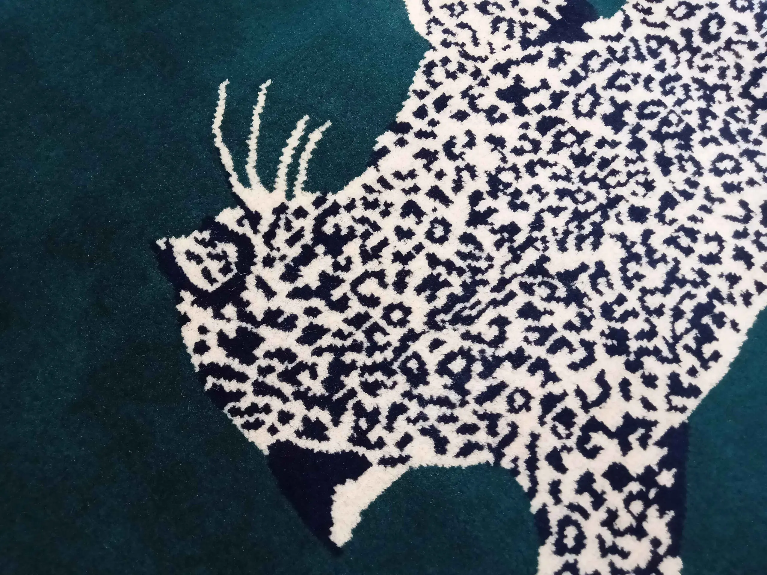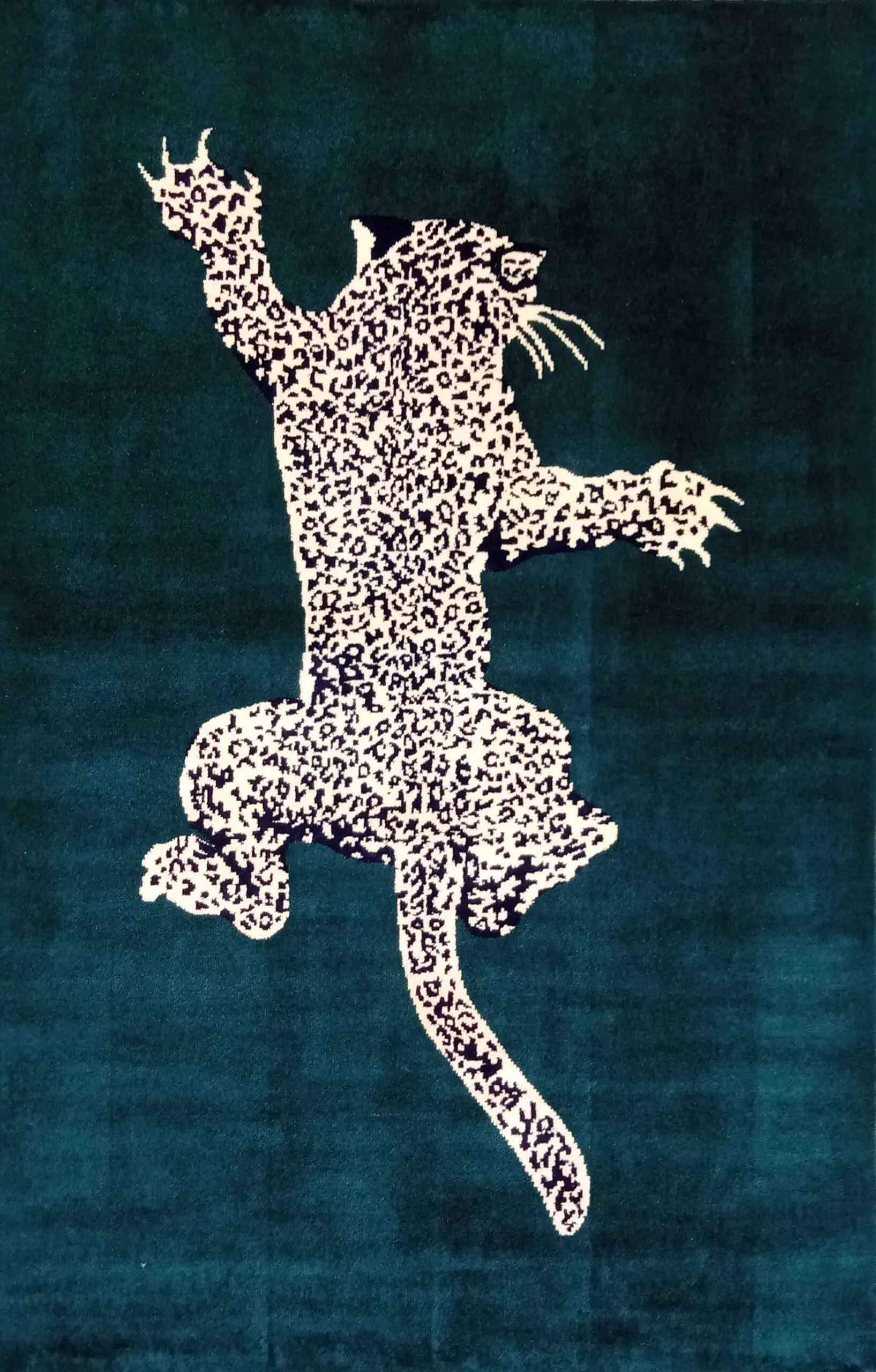 Carpet weaving is an ancient art, but designs and aesthetics constantly evolve. Nowadays, a high-quality handmade animal print carpet signifies modern luxury and fearless self-expression. It takes incredible precision and skill to create the exact shape and splotches of a leopard that climbs with such realism. For this impeccable modern green leopard rug, our master craftsmen at Jaipur Carpet Studio spend months tying thousands of intricate knots.